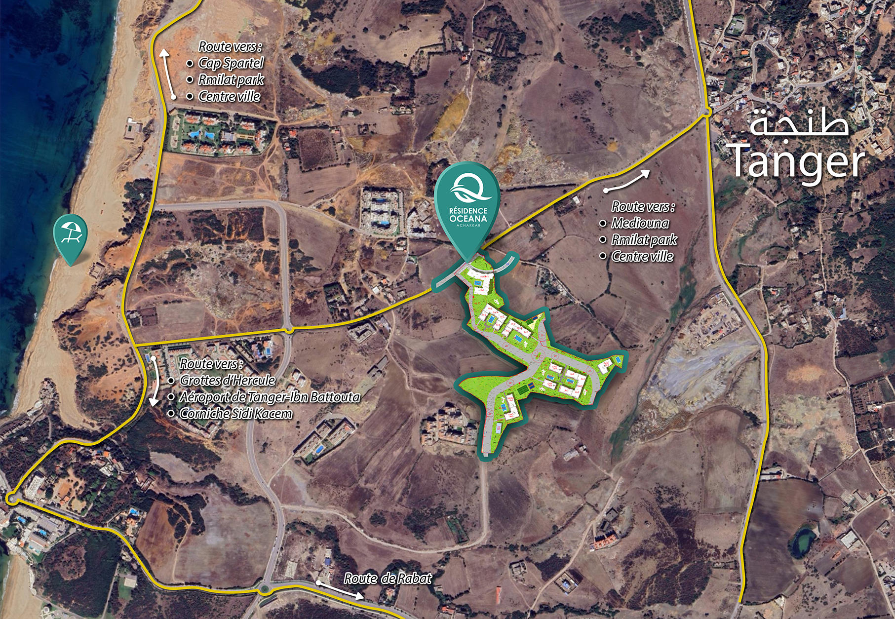 Nestled between Cap Spartel, the Caves of Hercules, and many other exceptional sites, the residential and seaside complex “RÉSIDENCE OCEANA – ACHAKKAR” invites you to discover a world of tranquility with its luxury apartments and hotel residences, harmoniously spread across 15 blocks with ground plus one and ground plus two floors.