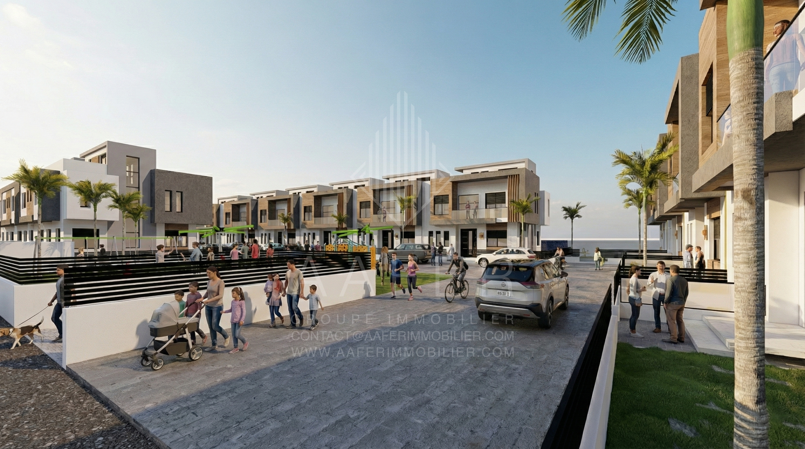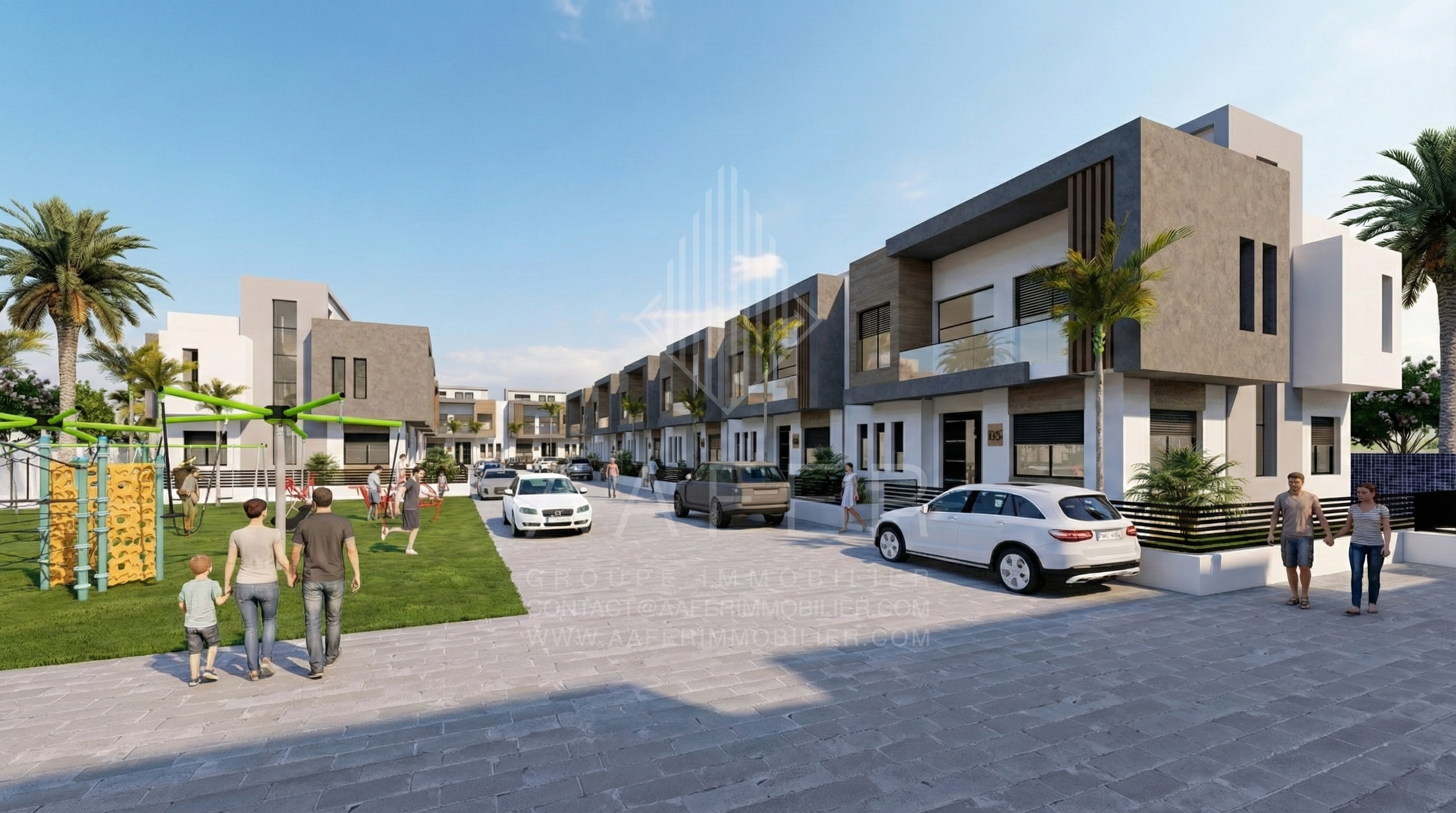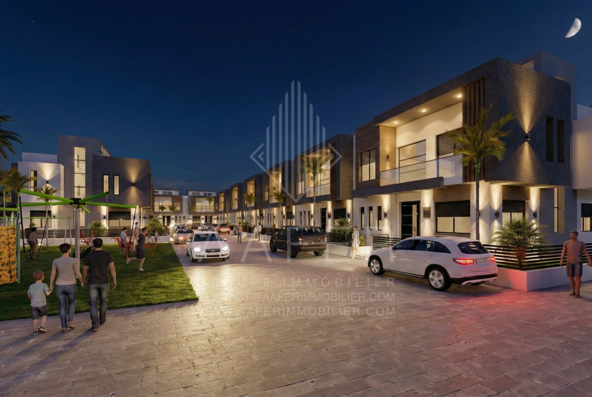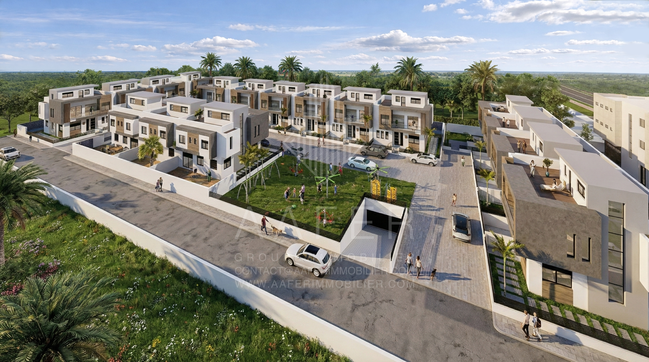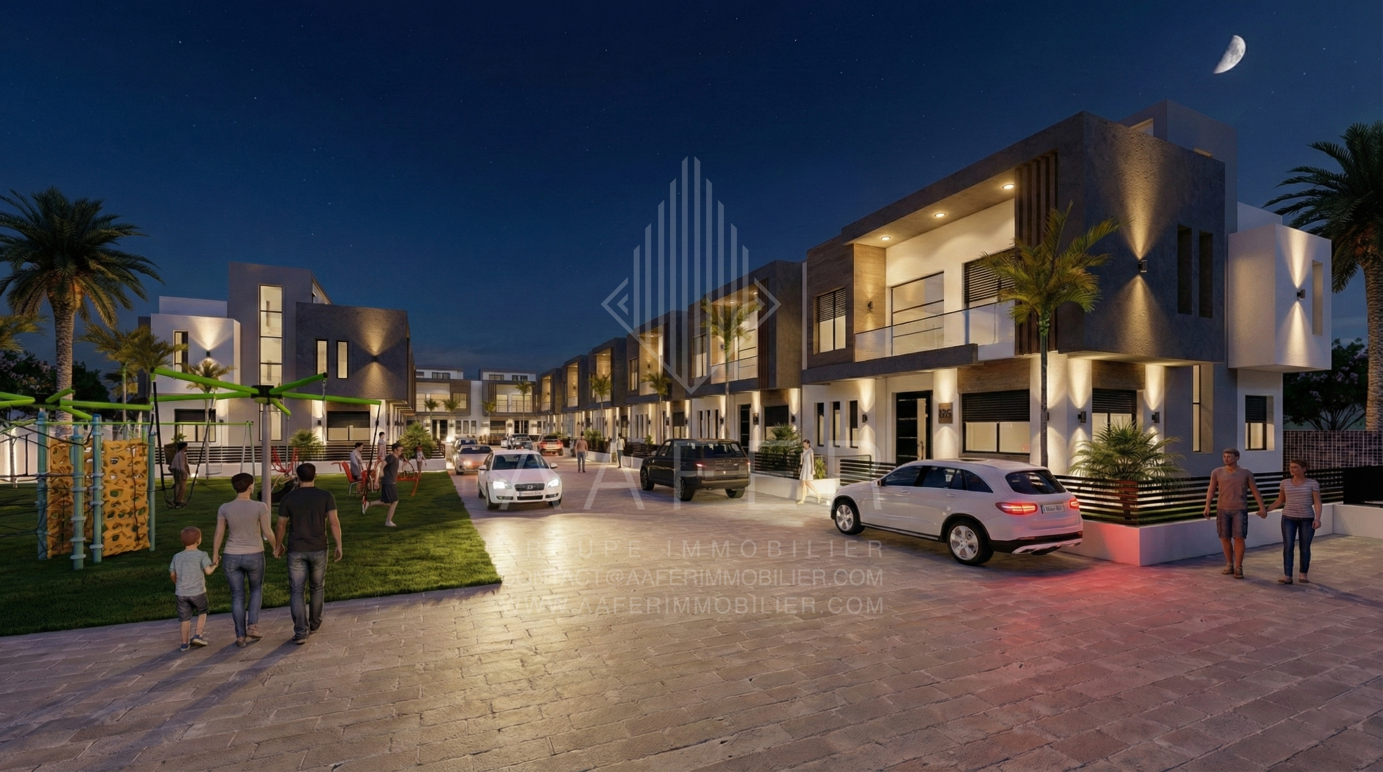Puerta de Tetuán, la nouvelle signature de prestige du Groupe AAFER Immobilier. Ce complexe exclusif de villas se distingue par son architecture contemporaine et épurée, et ses façades blanches lumineuses. De vastes baies vitrées inondent chaque espace de lumière, offrant une fluidité parfaite entre l’intérieur et l’extérieur.