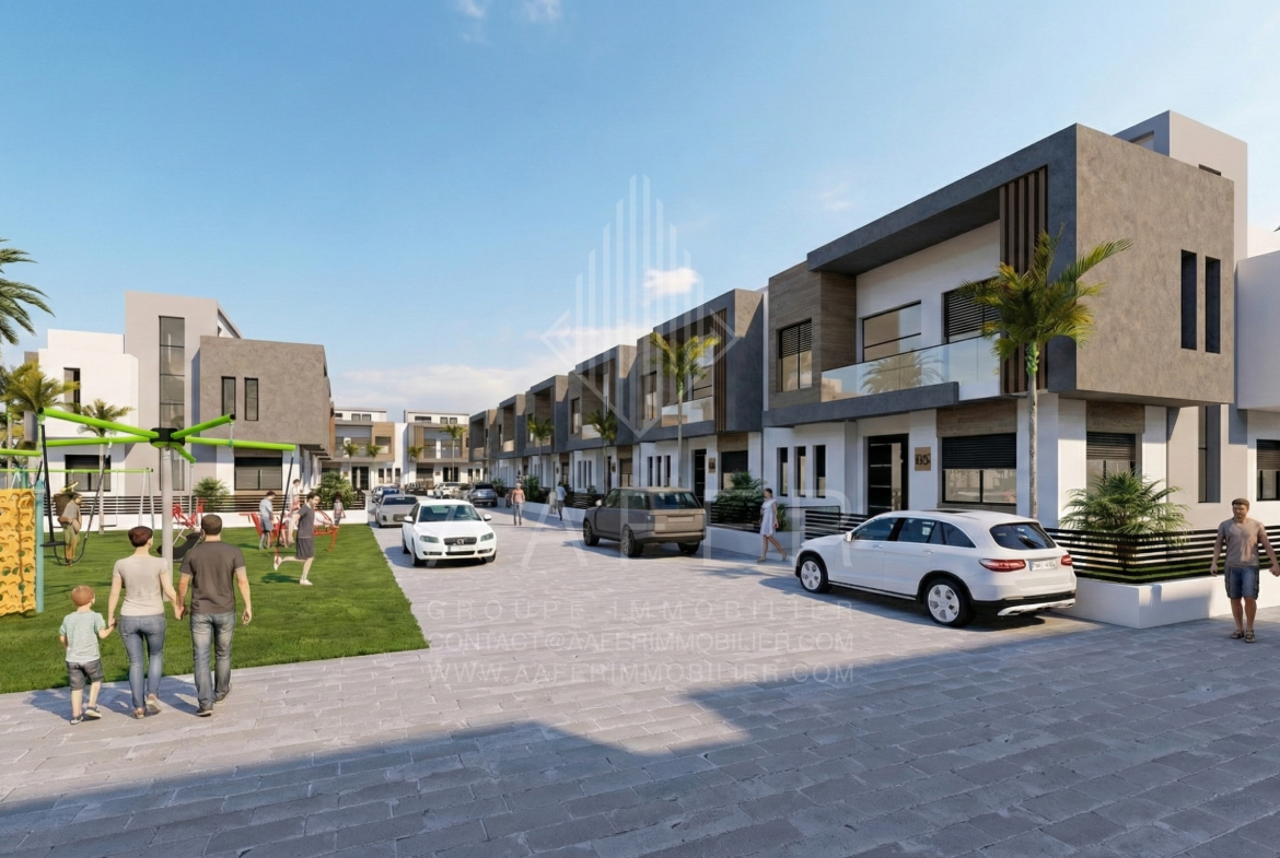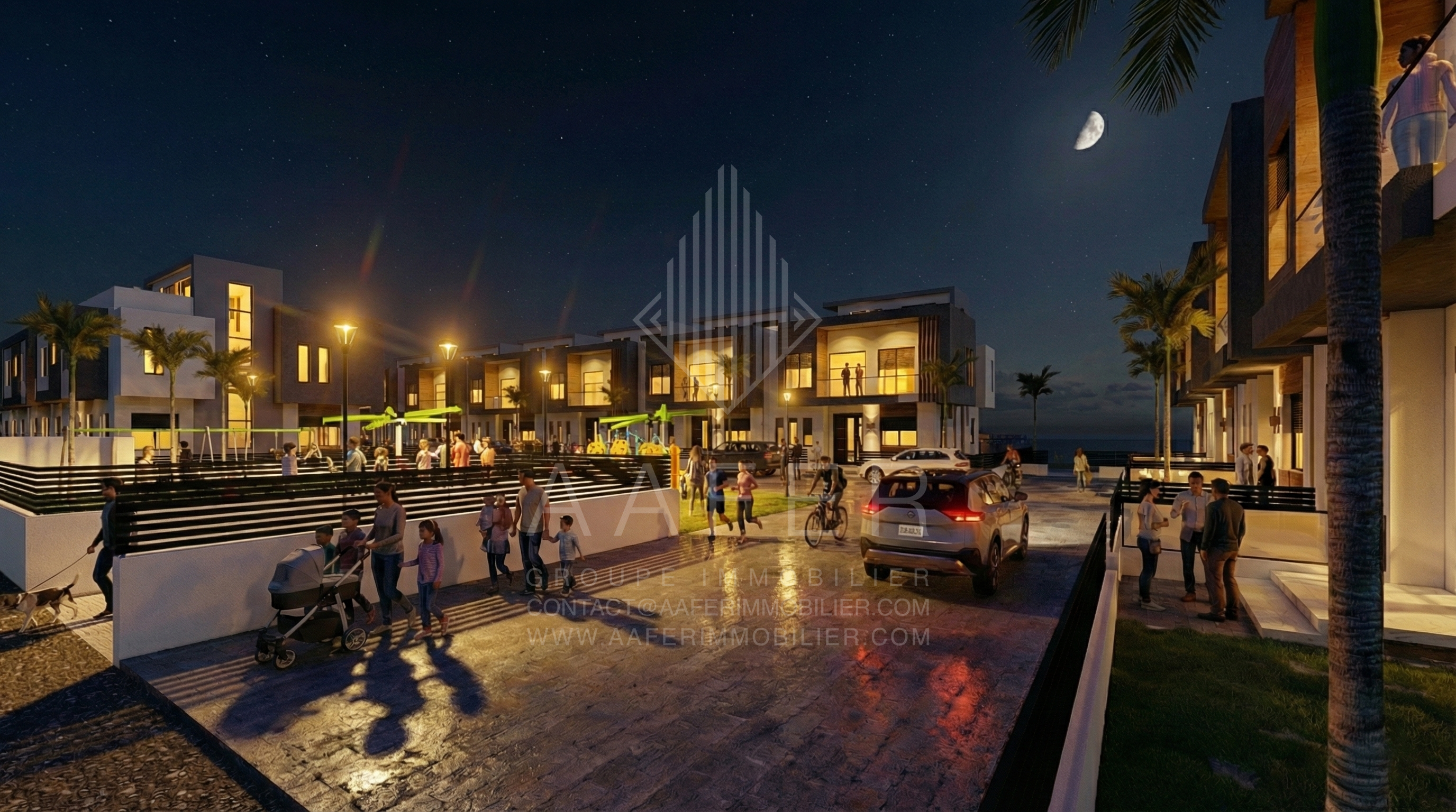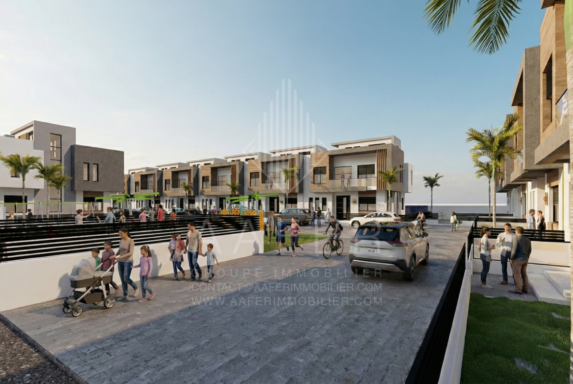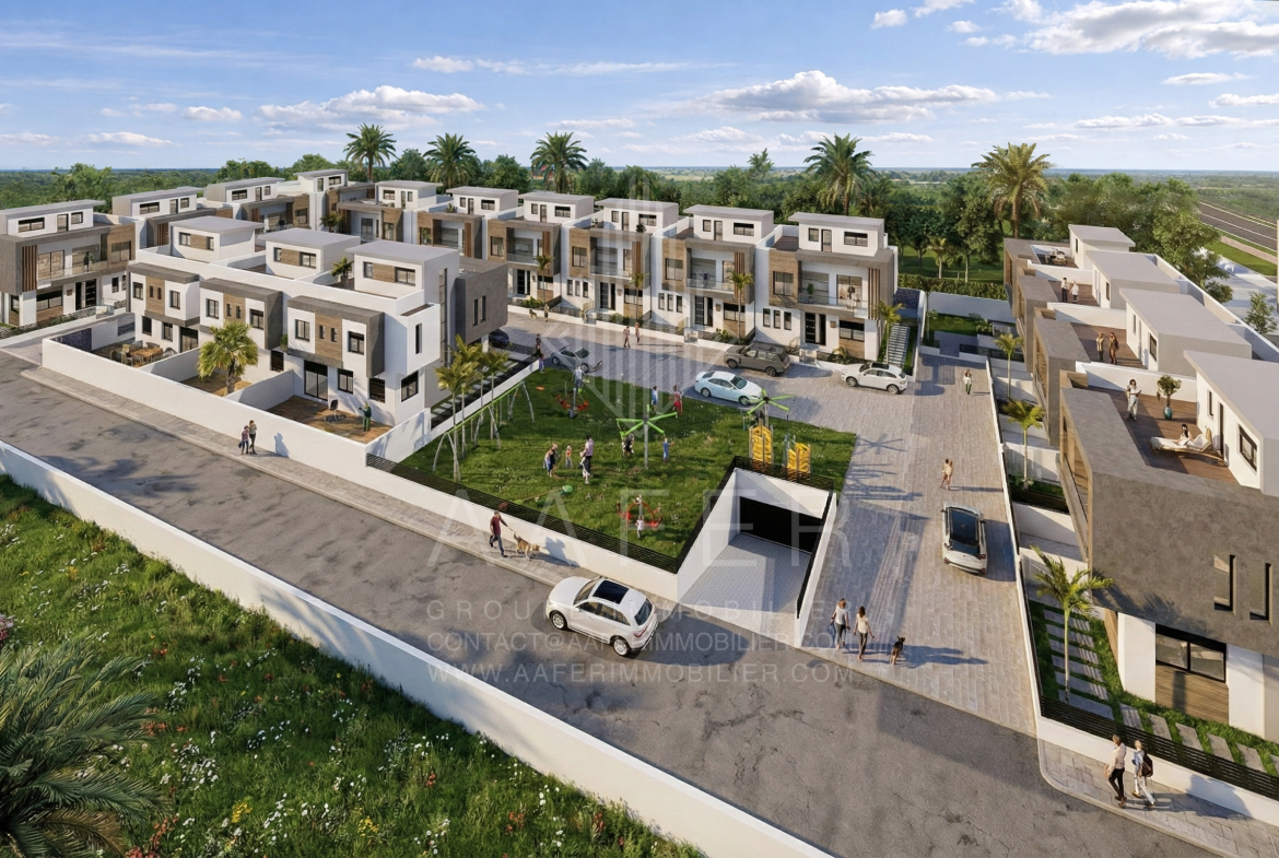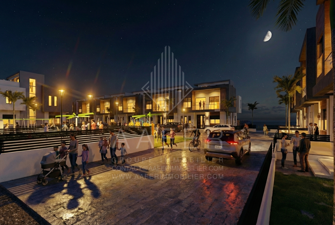 Puerta de Tetuán, la nouvelle signature de prestige du Groupe AAFER Immobilier. Ce complexe exclusif de villas se distingue par son architecture contemporaine et épurée, et ses façades blanches lumineuses. De vastes baies vitrées inondent chaque espace de lumière, offrant une fluidité parfaite entre l’intérieur et l’extérieur.